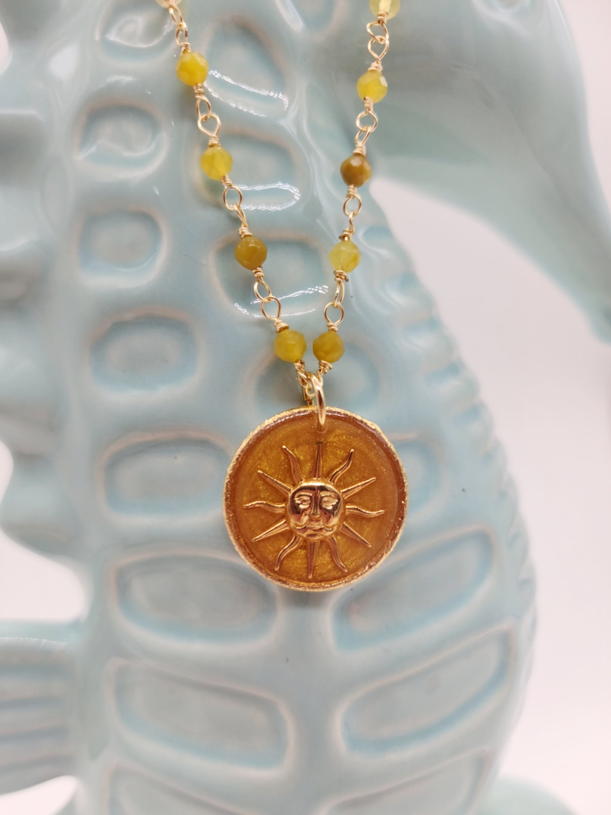 Este collar captura la energía del sol y la transforma en una joya delicada y llena de intención. Está elaborado con cristalitos amarillos que reflejan la luz con cada movimiento, unidos a una cadena hecha a mano, pieza por pieza, cuidando cada detalle.