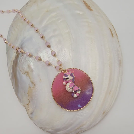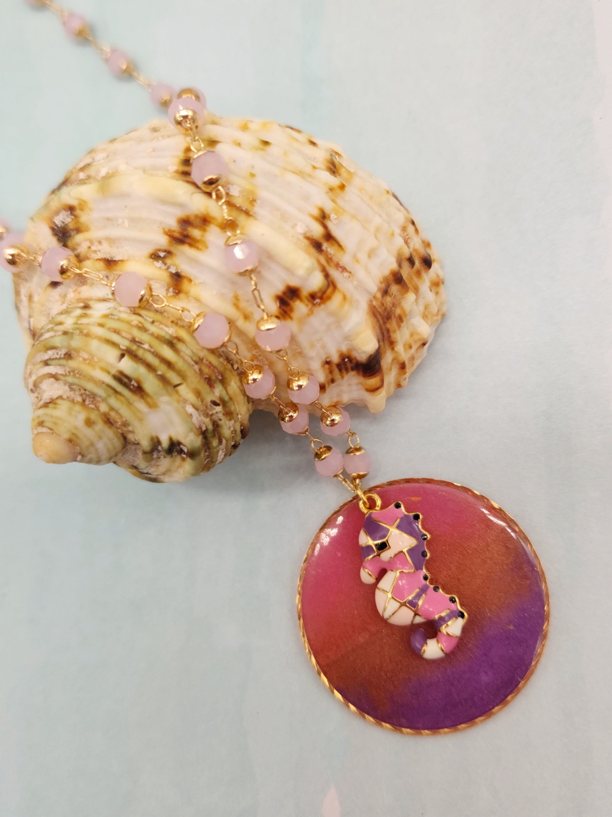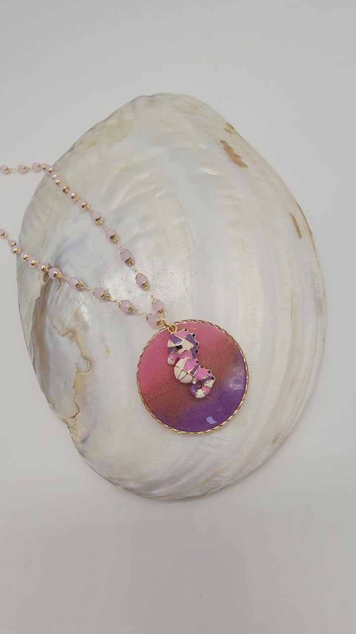 El protagonista es un dije de caballito esmaltado en goldfilled, un símbolo marino lleno de encanto y delicadeza, colocado sobre un disco de resina en tonos rosado y morado. Cada pieza de resina es única, con matices que evocan los colores del mar en calma al atardecer.