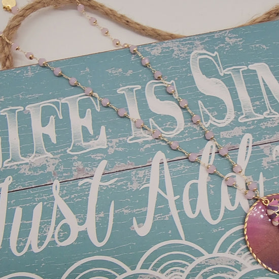 Un accesorio que captura la magia del océano en un diseño lleno de dulzura y sofisticación. Este collar está elaborado con una cadena de cristales rosados que reflejan la luz con cada movimiento, aportando un brillo sutil y femenino.