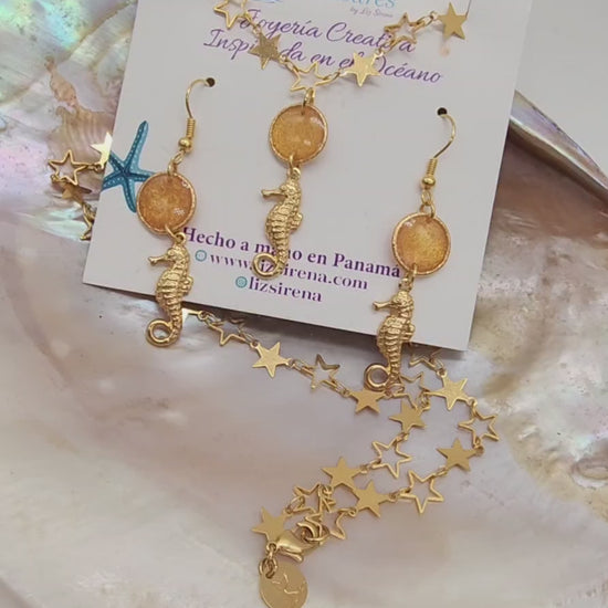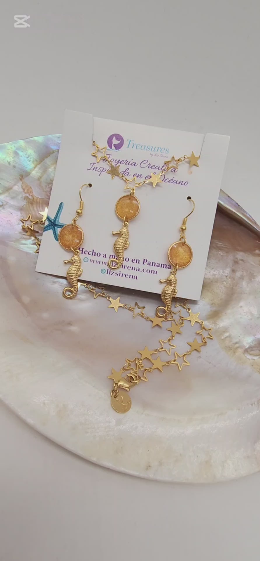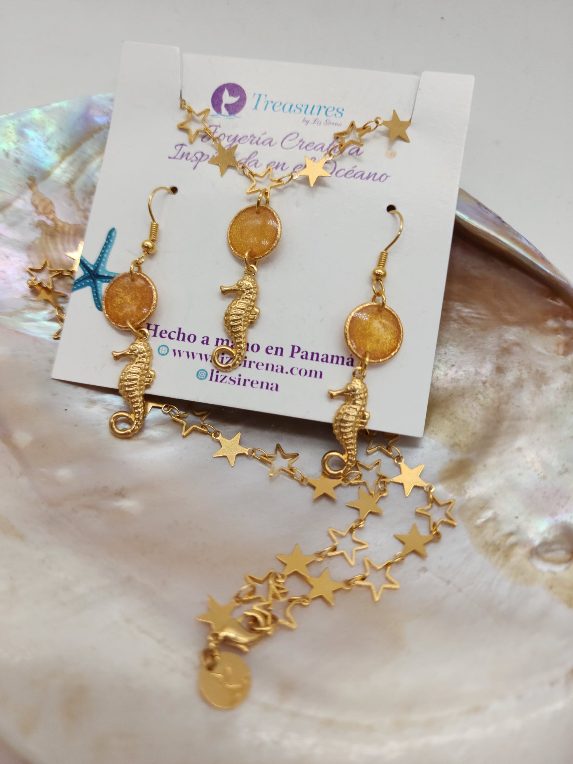 El collar cuenta con una cadena en goldfilled con estrellitas que añaden un toque celestial, acompañada de un dije de caballito de mar sobre discos de resina en dorado que evocan la luz del sol sobre el mar. Los aretes a juego completan el set con un estilo sofisticado y único.