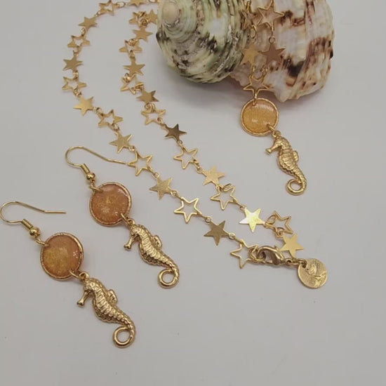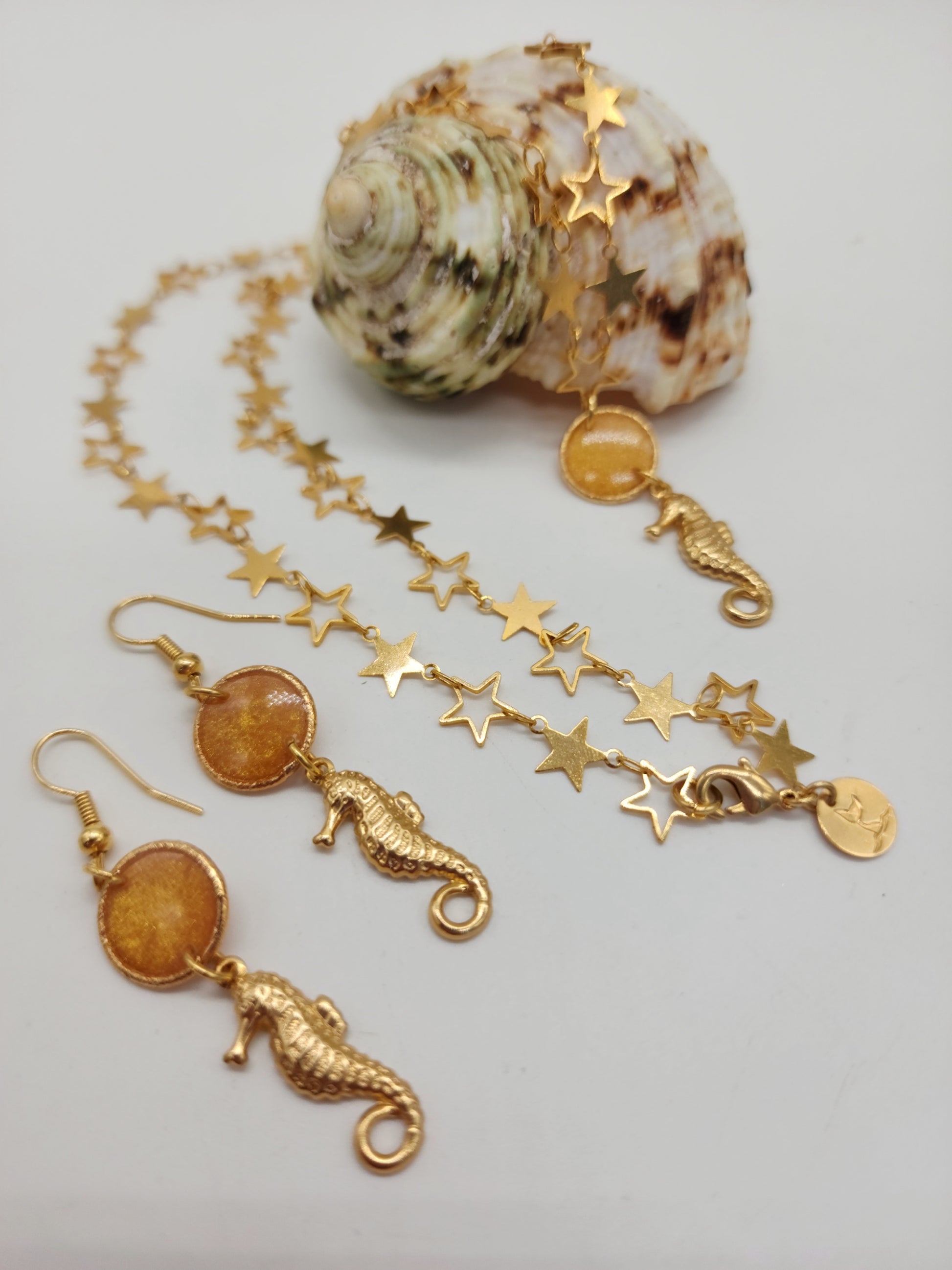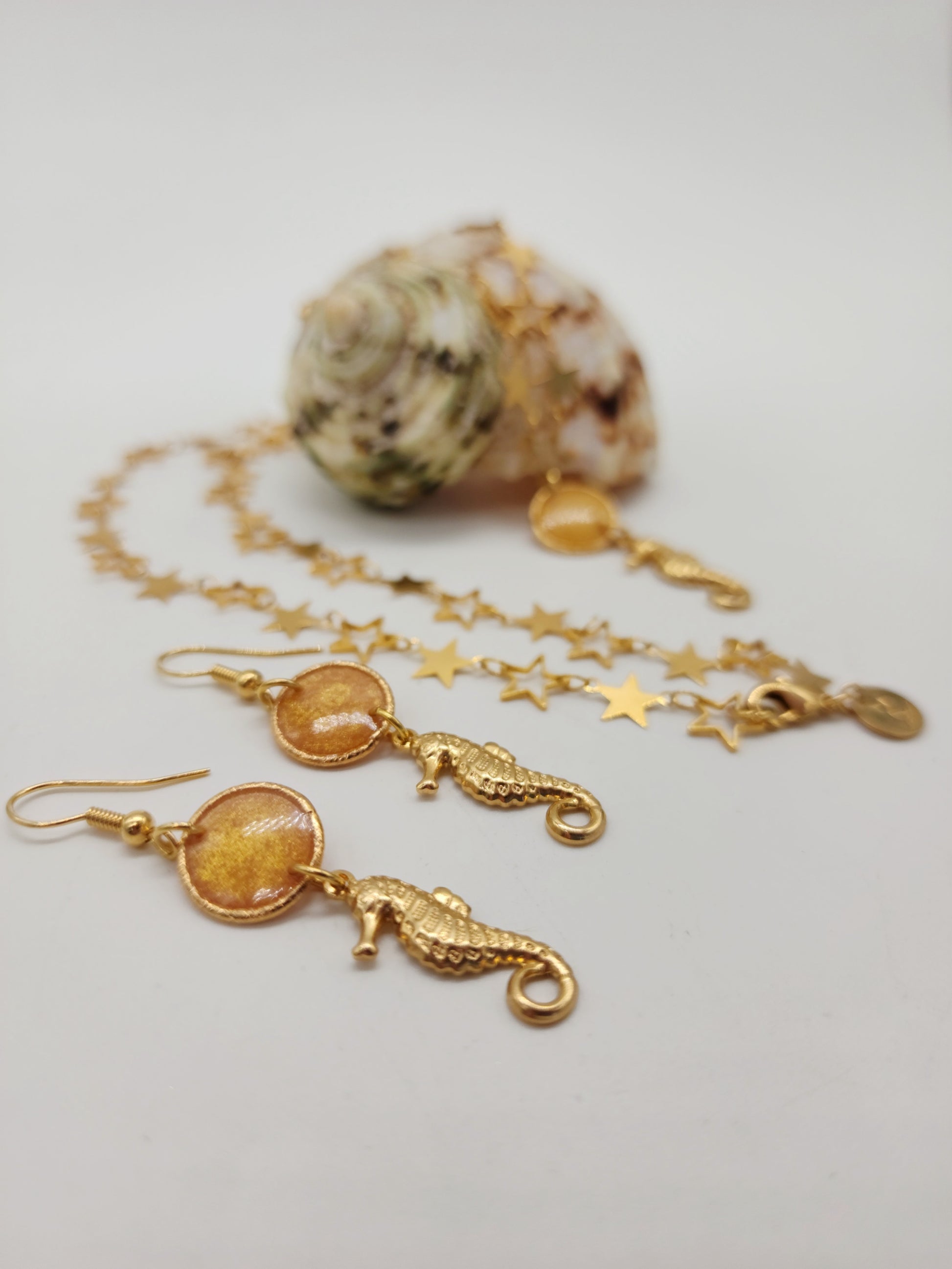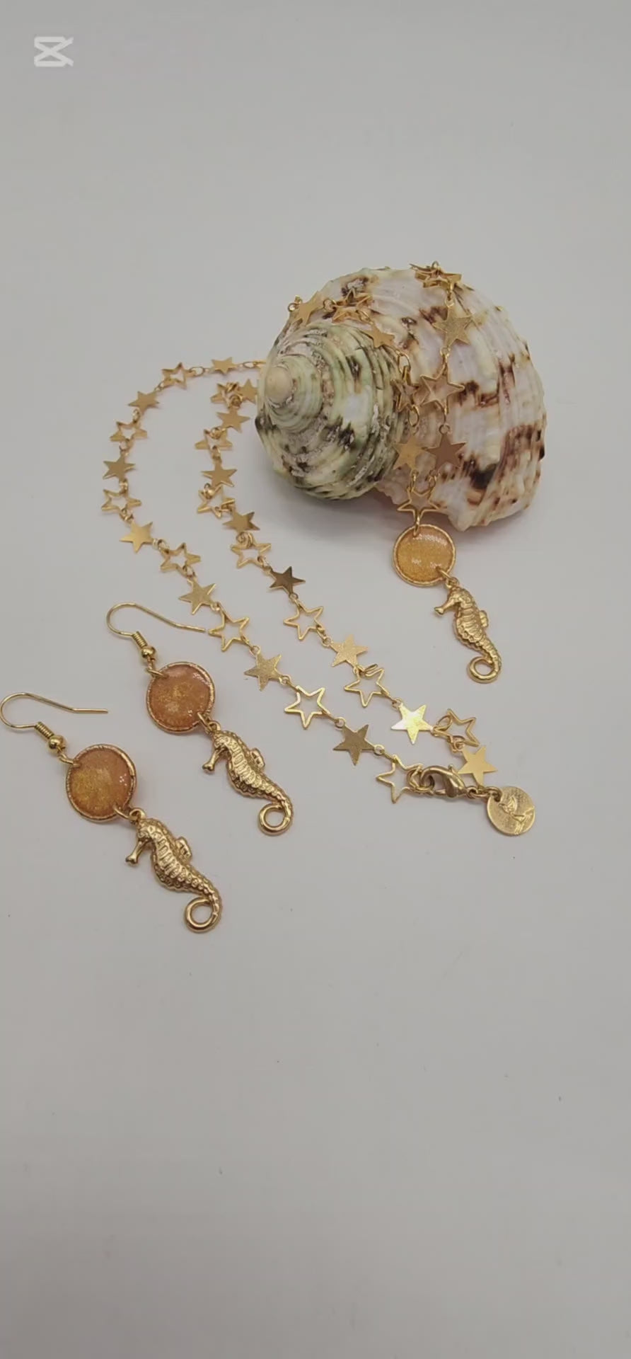 El collar cuenta con una cadena en goldfilled con estrellitas que añaden un toque celestial, acompañada de un dije de caballito de mar sobre discos de resina en dorado que evocan la luz del sol sobre el mar. Los aretes a juego completan el set con un estilo sofisticado y único.