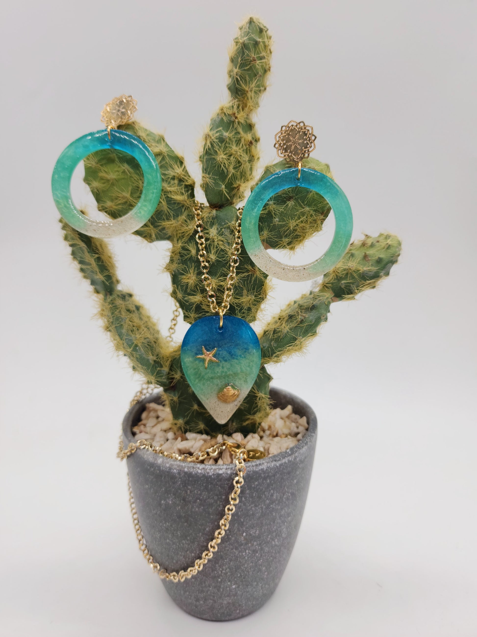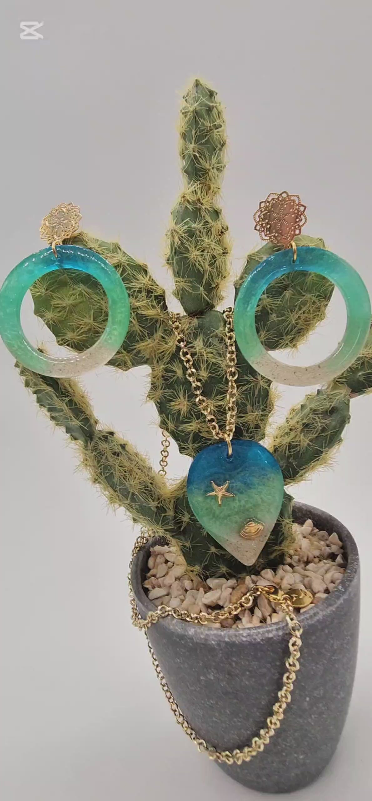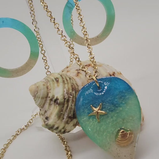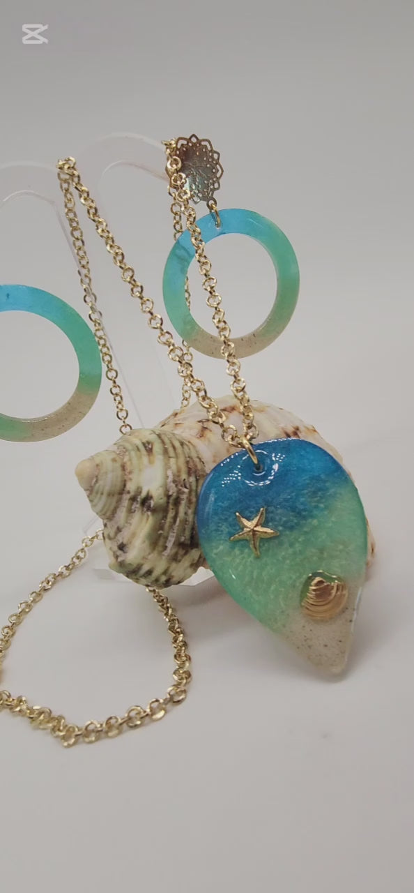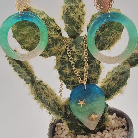 Lleva contigo la magia del océano con este juego de aretes y dije en resina y cadena de rodio, diseñado en formato maxi para brillar en cualquier ocasión. Cada pieza está trabajada con arena real y tonos azul y verde mar que evocan la tranquilidad y frescura de la playa.