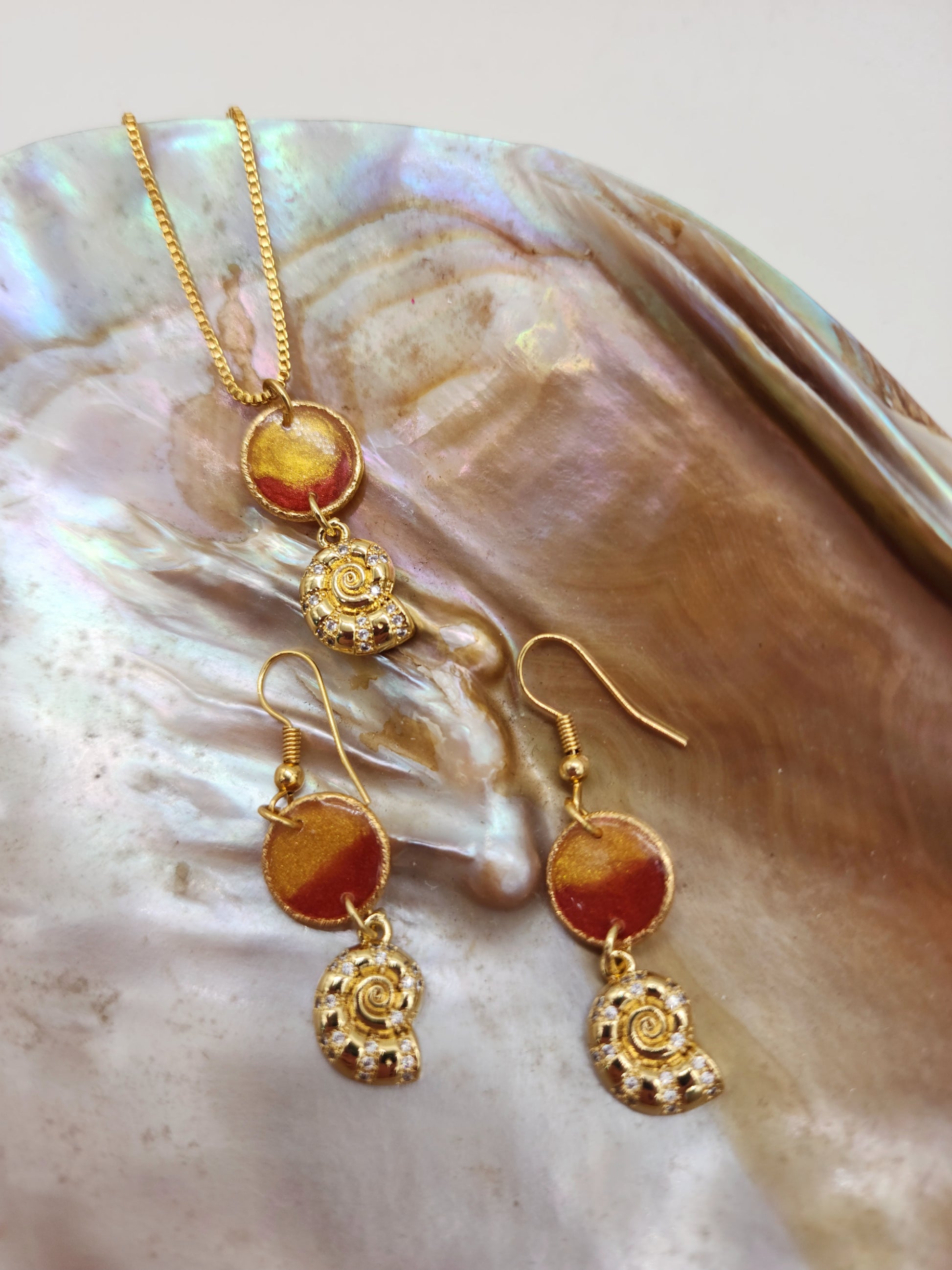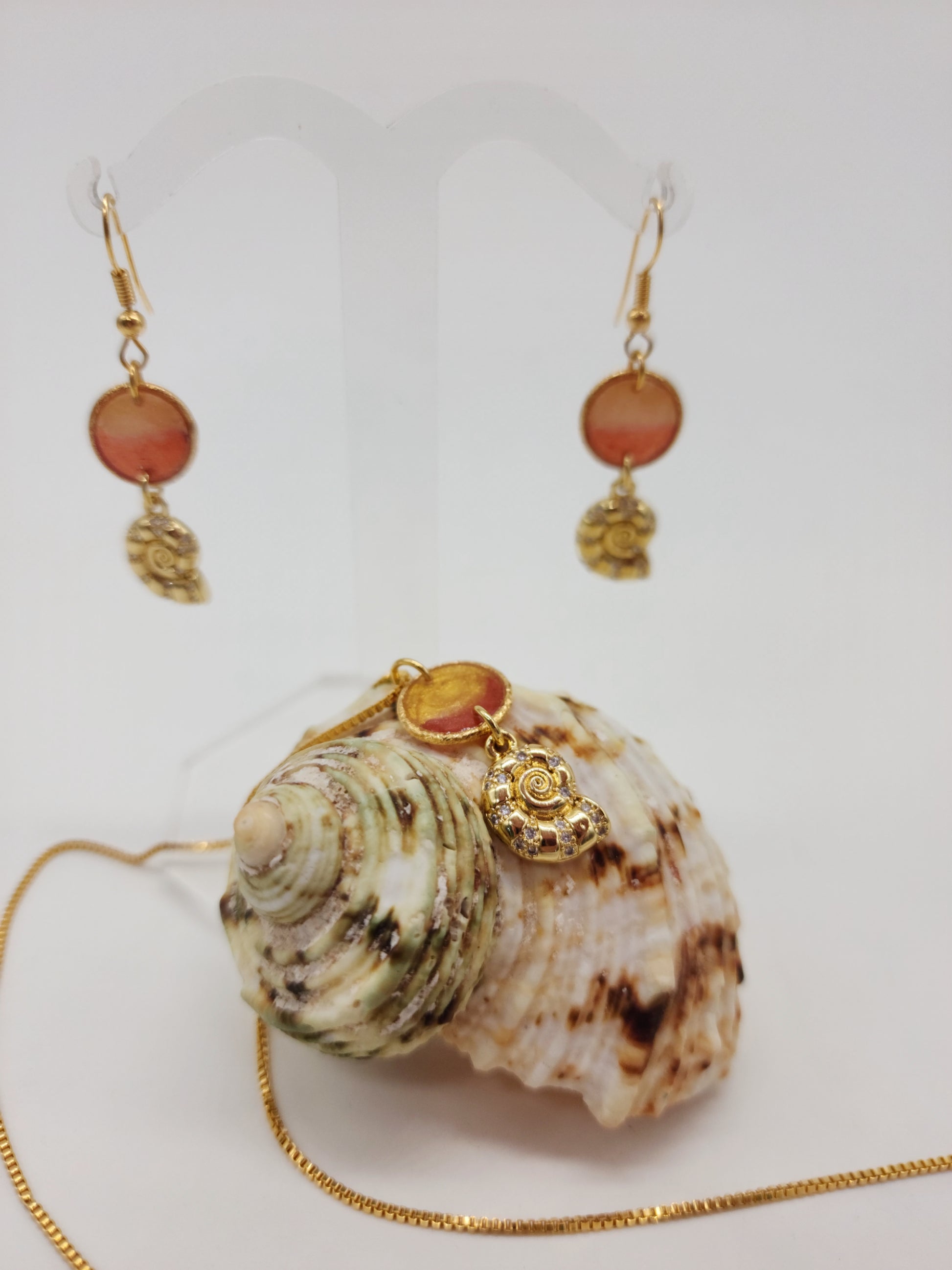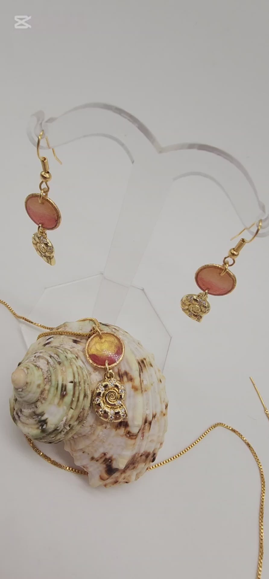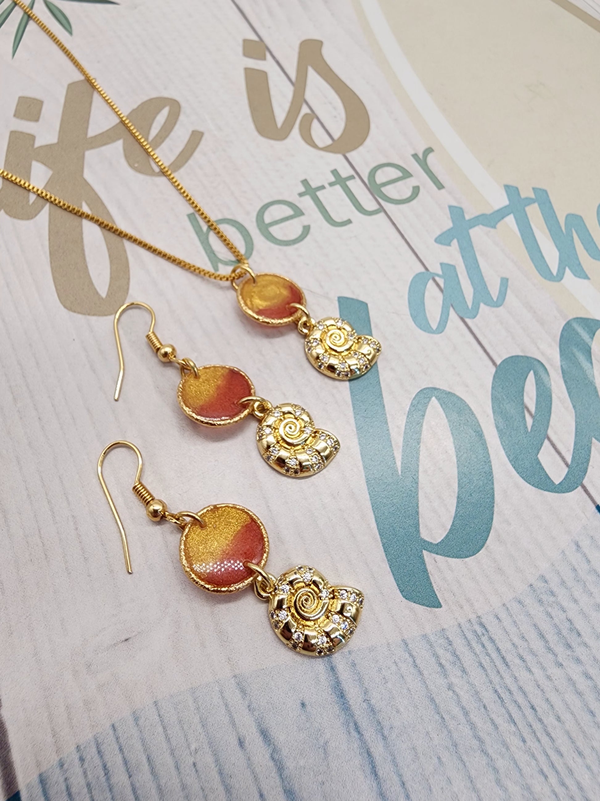 El set combina caracolas en goldfilled con delicados brillantitos y discos de resina en tonos anaranjado y dorado, que reflejan la luz y los colores de un cielo al caer el sol. Cada pieza está hecha a mano, cuidando cada detalle para que lleves contigo un pedacito del océano y su encanto.