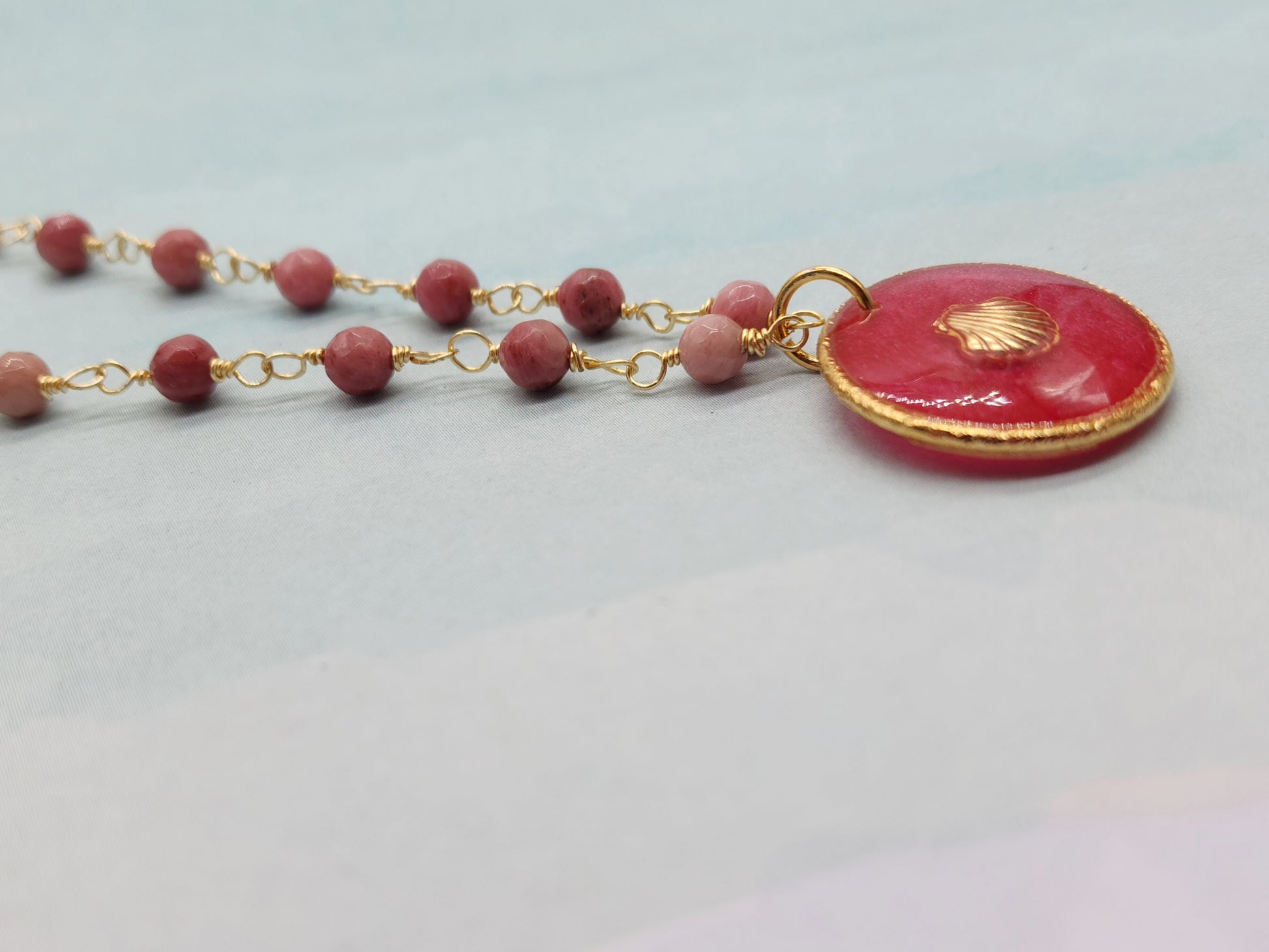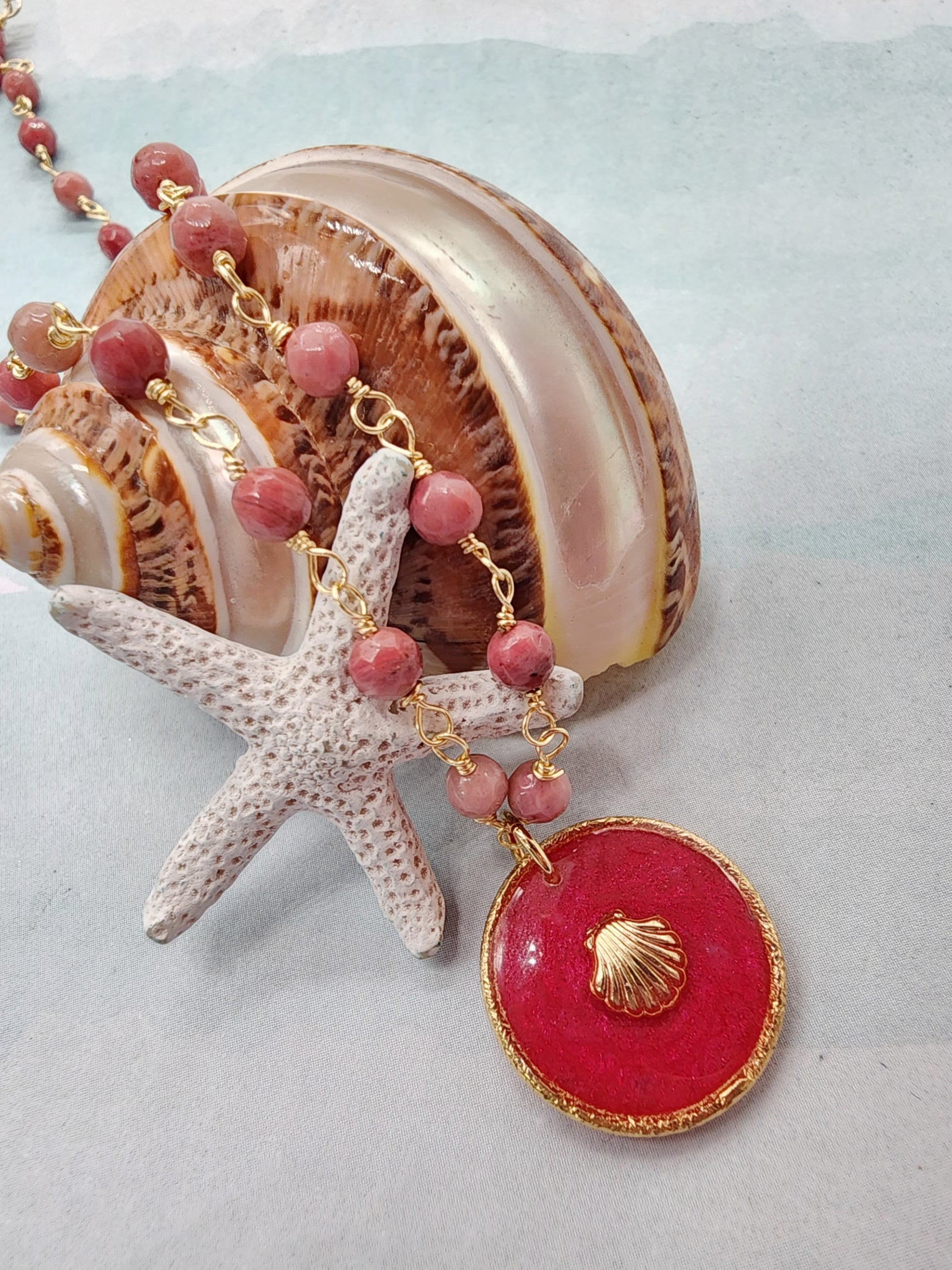 Este collar evoca la suavidad del mar en calma y la belleza de los tesoros que deja la marea. Está elaborado con cristalitos rosados que aportan un brillo sutil y romántico, unidos en una cadena hecha a mano, donde cada detalle refleja el trabajo artesanal.
