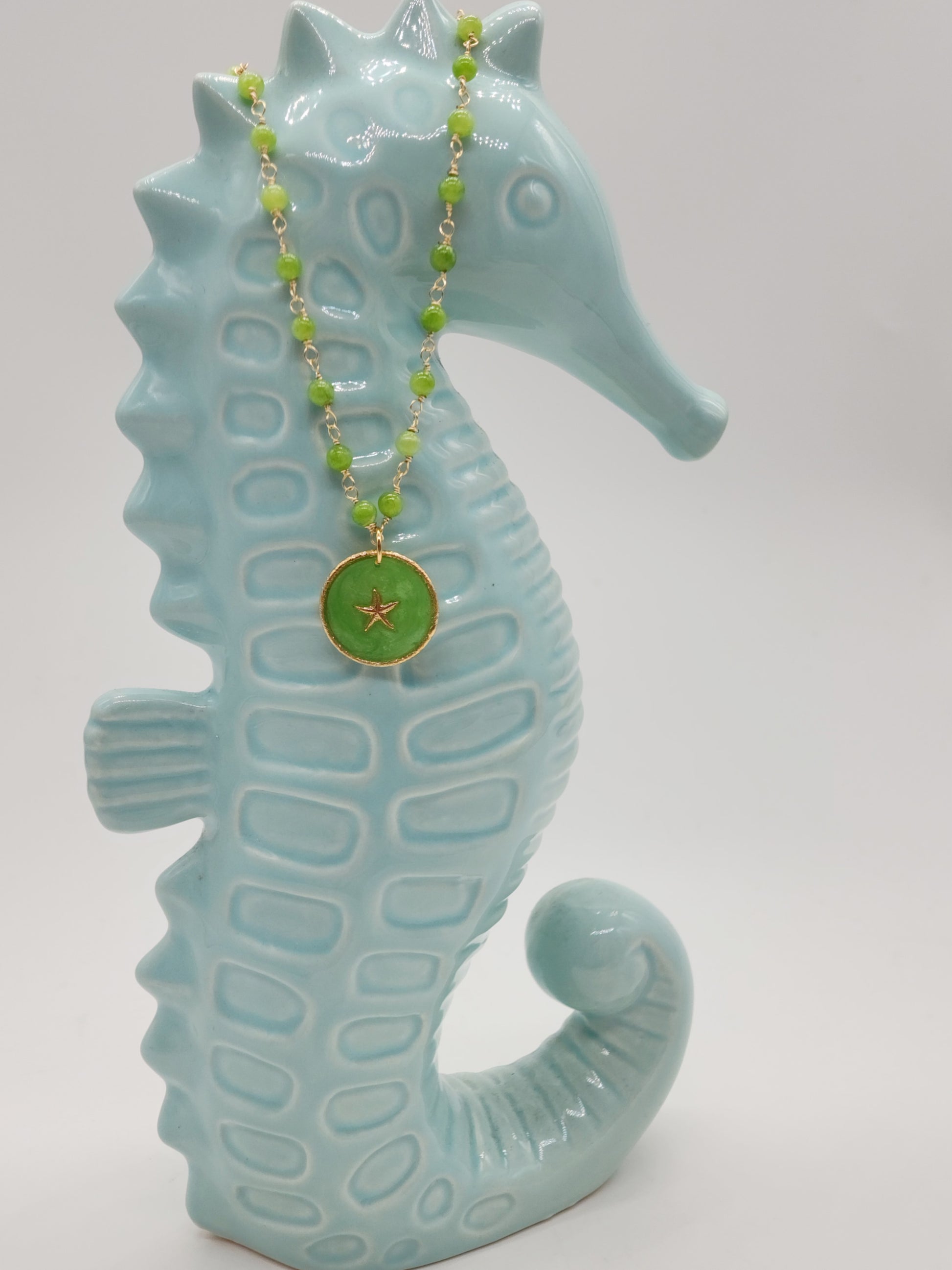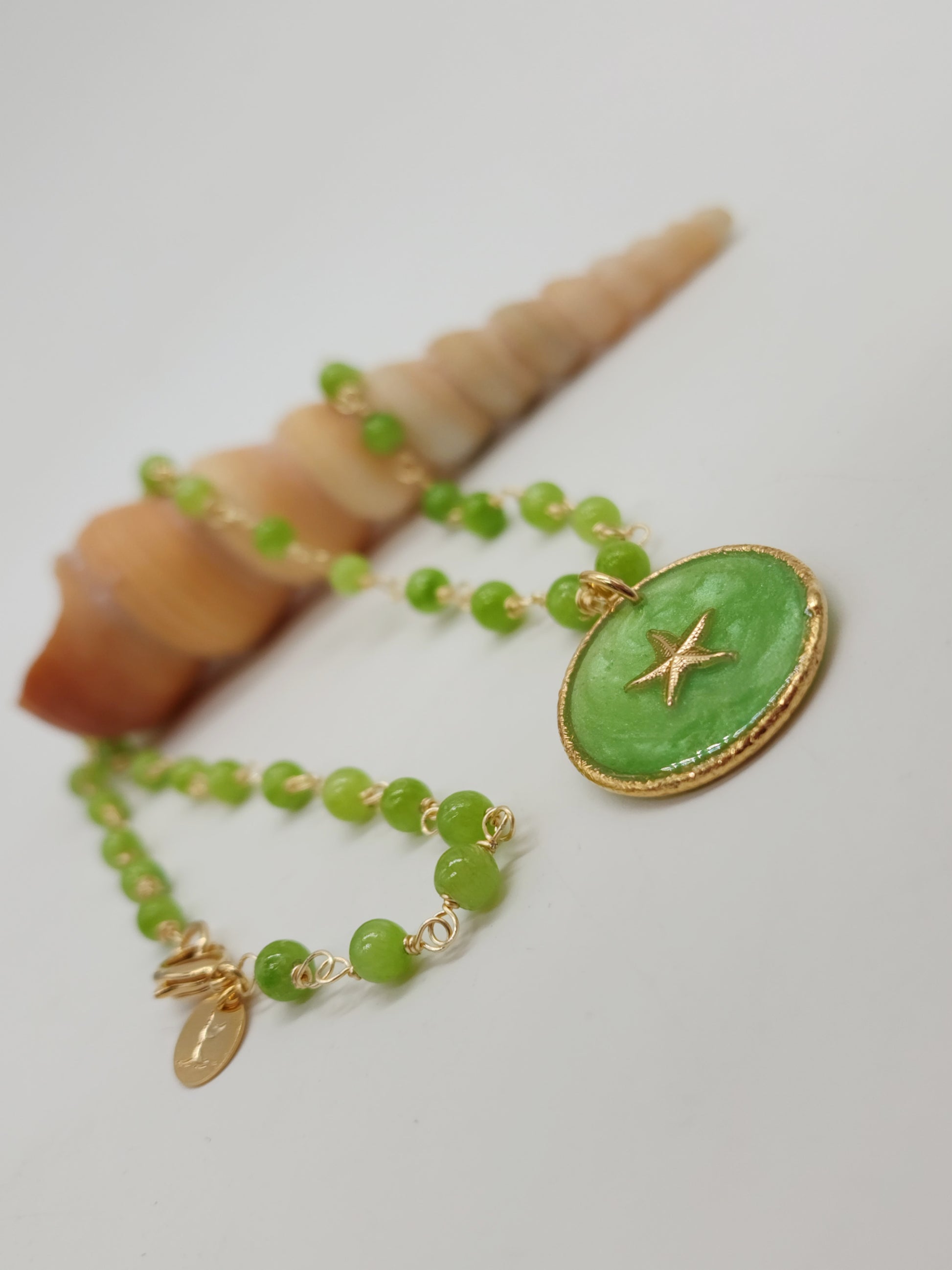 El dije de resina resguarda un delicado charm de estrellita de mar en goldfilled, símbolo de renovación, equilibrio y guía. Una joya ligera y especial, perfecta para acompañarte en tus días y recordarte la magia que habita en el mar.